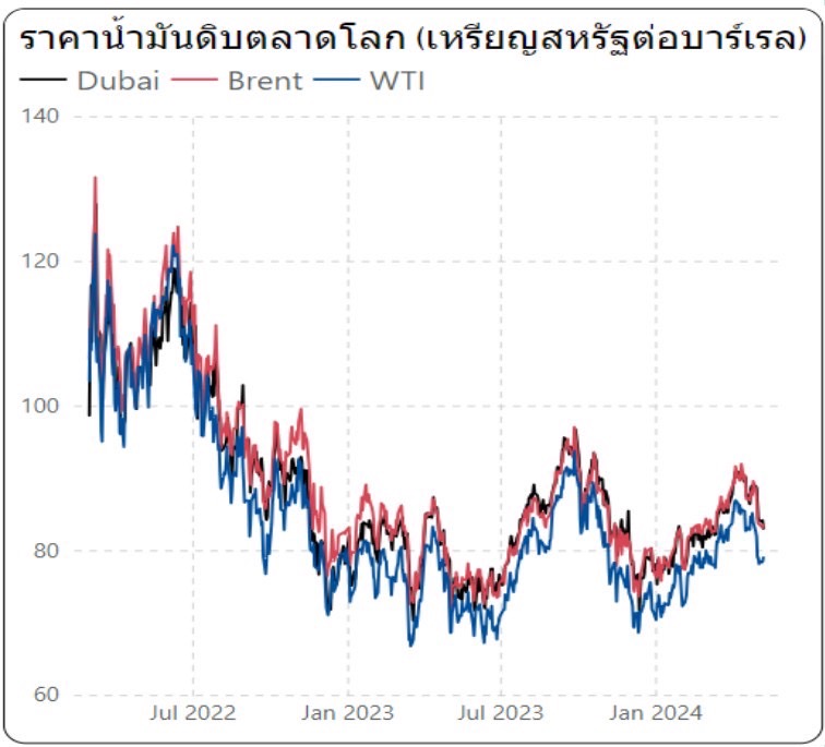โดยที่ผ่านมา พบว่า ราคาน้ำมันโลก (ระหว่างวันที่ 6-12 พฤษภาคม 2567) ราคาน้ำมันดิบดูไบ เฉลี่ยอยู่ที่ระดับ 84.13 เหรียญสหรัฐต่อบาร์เรล ปรับตัวลดลงจากสัปดาห์ที่แล้ว 2.39 เหรียญสหรัฐต่อบาร์เรล ส่วนน้ำมันดิบเวสต์เทกซัส เฉลี่ยอยู่ที่ระดับ 78.67 เหรียญสหรัฐต่อบาร์เรล ปรับตัวลดลงจากสัปดาห์ที่แล้ว 1.45 เหรียญสหรัฐต่อบาร์เรล