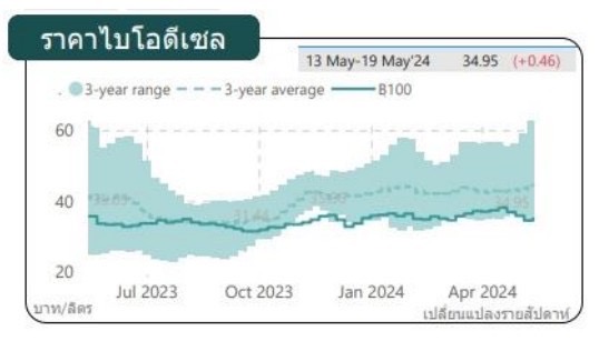 ส่วนราคาน้ำมันไบโอดีเซล อ้างอิงเฉลี่ยระหว่างวันที่ 13-19 พฤษภาคม 2567 ที่ผ่านมา อยู่ที่ราคา 34.49 บาทต่อลิตร เพิ่มขึ้นจากสัปดาห์ก่อน 0.46 บาทต่อลิตร จากสถานการณ์ราคาผลปาล์มน้ำมัน ณ วันที่ 6-10 พฤษภาคม 2567 เฉลี่ยอยู่ที่ 32.38 บาทต่อกิโลกรัม ขณะนี้ราคาน้ำมันปาล์มดิบมาเลเซีย ราคาเฉลี่ยอยู่ที่ 30.76 บาทต่อกิโลกรัม เพิ่มขึ้นจากสัปดาห์ก่อน 0.25 บาทต่อกิโลกรัม